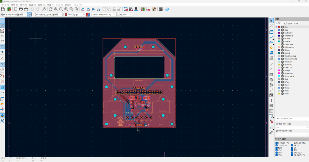PoliviaBot UMEの土台となる基板は、KiCadを使って設計されています。