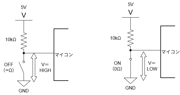 入力ピンを、何もしていないときは「HIGH」に引っ張っておく回路構成です。