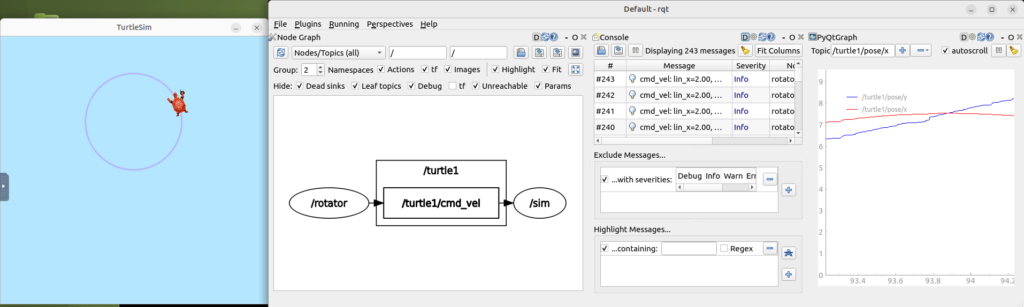 これらはターミナルにも表示されますが、rqt_consoleを使うとログを時系列で整理して閲覧できます。